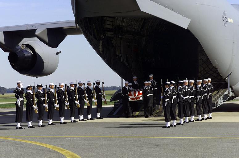 Keywords: df-sd-01-07361 dfsd0107361 dover de usa vehicle airplane aircraft 330-CFD-DF-SD-01-07361: The United States Navy Ceremonial Guard honors fallen members from USS COLE (DDG 67) at Dover Air Force Base, Delaware, as their remains are removed from a US Air Force C-17 Globemaster III aircraft on October 14, 2000. The sailors were killed in an explosion resulting from a terrorist attack on the COLE in Yemen, 10/14/2000. Official U.S. Navy photograph, now in the collections of the U.S. National Archives: Public Online Access. 330-CFD-DF-SD-01-07361: The United States Navy Ceremonial Guard honors fallen members from USS COLE (DDG 67) at Dover Air Force Base, Delaware, as their remains are removed from a US Air Force C-17 Globemaster III aircraft on October 14, 2000. The sailors were killed in an explosion resulting from a terrorist attack on the COLE in Yemen, 10/14/2000. Official U.S. Navy photograph, now in the collections of the U.S. National Archives: Public Online Access. |