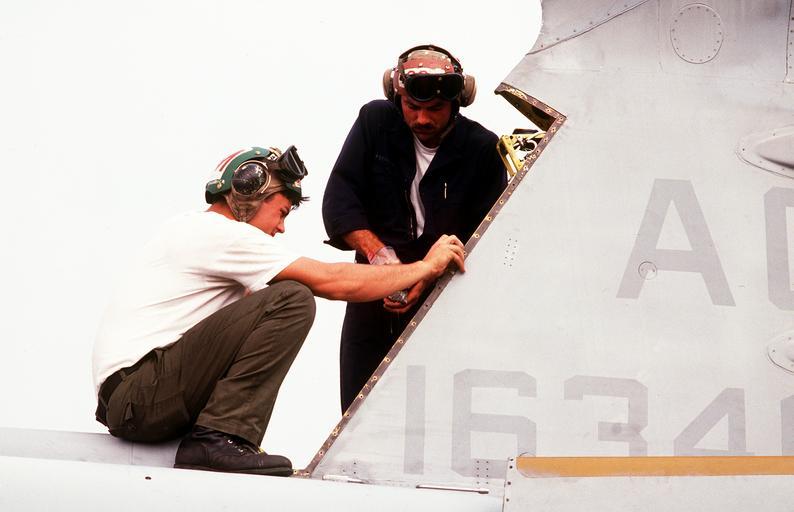 Keywords: df-st-98-00469 dfst9800469 aviano air base avianoairbase italy 330-CFD-DF-ST-98-00469: Two US Navy aircraft maintenance personnel perform a 56 day preventive maintenance inspection on a US Navy EA-6B Prowler on the flightline. The aircraft is from Tactical Electronic Warfare Squadron 141 deployed on board the aircraft carrier USS Theodore Roosevelt (CVN-71). The Roosevelt is operating in the Adriatic Sea in support of the operation, 9/12/1995. (OPA-NARA II-8/17/2015). 330-CFD-DF-ST-98-00469: Two US Navy aircraft maintenance personnel perform a 56 day preventive maintenance inspection on a US Navy EA-6B Prowler on the flightline. The aircraft is from Tactical Electronic Warfare Squadron 141 deployed on board the aircraft carrier USS Theodore Roosevelt (CVN-71). The Roosevelt is operating in the Adriatic Sea in support of the operation, 9/12/1995. (OPA-NARA II-8/17/2015). |