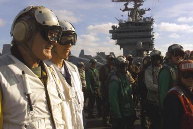 Keywords: dn-sd-03-00129 dnsd0300129 uss harry s. truman ussharrystruman atlantic ocean (aoc) atlanticoceanaoc 330-CFD-DN-SD-03-00129: Fox Sports celebrity Terry Bradshaw and Rear Admiral James D. McArthur Jr., Commander Carrier Group TWO, observe flight deck operations on board USS Harry S. Truman (CVN 75). The Fox Sports host is on board to tape the popular NFL pre-game show aired on the FOX Network. Truman is on a scheduled six-month deployment to the Mediterranean Sea and Arabian Gulf, 12/14/2000. PHAN Rodger D. Schilling, USN. (2016/05/04). 330-CFD-DN-SD-03-00129: Fox Sports celebrity Terry Bradshaw and Rear Admiral James D. McArthur Jr., Commander Carrier Group TWO, observe flight deck operations on board USS Harry S. Truman (CVN 75). The Fox Sports host is on board to tape the popular NFL pre-game show aired on the FOX Network. Truman is on a scheduled six-month deployment to the Mediterranean Sea and Arabian Gulf, 12/14/2000. PHAN Rodger D. Schilling, USN. (2016/05/04). |