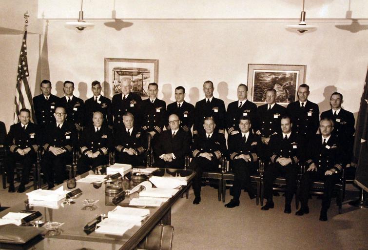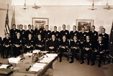 Keywords: group performance indoor 330-PS-1290 (USN 708197): Naval Reserve Policy Board Holds Annual Meeting. Various Naval Districts and Naval Officials in Washington, D.C. met in the Pentagon on April 9, 1951, to open their annual two week meeting for the purpose of formulating plans and policies for future operations of the U.S. Naval Reserve program. The board, headed by Secretary of the Navy Francis P. Matthews, included Admiral Forrest P. Sherman, Vice Admiral Laurence T. Dubose, Chief of Naval Personnel, and Rear Admiral R.S. Riggs, Administrative Chief of Operations for the Naval Reserve. The Members of the Board: (front row, left to right): Captain F.B. Kirk, Third Naval District; Captain W.A. Neil, Fourth Naval District; Rear Admiral Rigs, Admiral Sherman, Secretary of the Navy Matthews; Vice Admiral Dubose; Captain John. H. Schultz, Assistant Chief of Naval Personnel; Commander E. H. Sutter, Sixth Naval District; and Commander John R. Hoyt, Commander of Naval Air Reserve Training Delegate. (Rear row, left to right): Commander L. M. King, Eleventh Naval District; Captain R.L. Johnson, Ninth Naval District; Commander P.G. Moltani, Bureau of Personnel (training) Delegate; Captain Edmund B. Taylor, Bureau of Personnel Delegate; Commander G.E. Glassock, Fifth Naval District; Captain Neal P. Pendleton, Eighth Naval District; Commander C.G. Pell, Fourteenth Naval District; Commander Jim K. Carpenter, Thirteenth Naval District; Captain Albert Berry, Twelfth Naval District; Lieutenant Commander A.A. Libbey, First Naval District, and Lieutenant Commander H.P. Ruben, Recorder. Photograph released April 11, 1951. (6/16/2015). 330-PS-1290 (USN 708197): Naval Reserve Policy Board Holds Annual Meeting. Various Naval Districts and Naval Officials in Washington, D.C. met in the Pentagon on April 9, 1951, to open their annual two week meeting for the purpose of formulating plans and policies for future operations of the U.S. Naval Reserve program. The board, headed by Secretary of the Navy Francis P. Matthews, included Admiral Forrest P. Sherman, Vice Admiral Laurence T. Dubose, Chief of Naval Personnel, and Rear Admiral R.S. Riggs, Administrative Chief of Operations for the Naval Reserve. The Members of the Board: (front row, left to right): Captain F.B. Kirk, Third Naval District; Captain W.A. Neil, Fourth Naval District; Rear Admiral Rigs, Admiral Sherman, Secretary of the Navy Matthews; Vice Admiral Dubose; Captain John. H. Schultz, Assistant Chief of Naval Personnel; Commander E. H. Sutter, Sixth Naval District; and Commander John R. Hoyt, Commander of Naval Air Reserve Training Delegate. (Rear row, left to right): Commander L. M. King, Eleventh Naval District; Captain R.L. Johnson, Ninth Naval District; Commander P.G. Moltani, Bureau of Personnel (training) Delegate; Captain Edmund B. Taylor, Bureau of Personnel Delegate; Commander G.E. Glassock, Fifth Naval District; Captain Neal P. Pendleton, Eighth Naval District; Commander C.G. Pell, Fourteenth Naval District; Commander Jim K. Carpenter, Thirteenth Naval District; Captain Albert Berry, Twelfth Naval District; Lieutenant Commander A.A. Libbey, First Naval District, and Lieutenant Commander H.P. Ruben, Recorder. Photograph released April 11, 1951. (6/16/2015). |