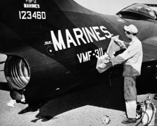 | Keywords: blackandwhite monochrome black and white 330-PS-246 (USN 707719a): New Letter Marking Authorized for Navy and Marine Corps Planes. The Navy has modified its aircraft marking specifications to authorize painting the word “Navy” or “Marines” in large letters on both sides of the fuselage and on the under surface of the left wings of Navy or Marine Corps planes. The new markings, which will be white on blue aircraft and black on other color planes, were authorized to facilitate identification of Navy and Marine Corps planes from ground and at close range. Present lettering is too small to be readable at any considerable distance. Aircraft is possibly a F9F. Photograph released May 7, 1950. (8/18/2015). 330-PS-246 (USN 707719a): New Letter Marking Authorized for Navy and Marine Corps Planes. The Navy has modified its aircraft marking specifications to authorize painting the word “Navy” or “Marines” in large letters on both sides of the fuselage and on the under surface of the left wings of Navy or Marine Corps planes. The new markings, which will be white on blue aircraft and black on other color planes, were authorized to facilitate identification of Navy and Marine Corps planes from ground and at close range. Present lettering is too small to be readable at any considerable distance. Aircraft is possibly a F9F. Photograph released May 7, 1950. (8/18/2015). |