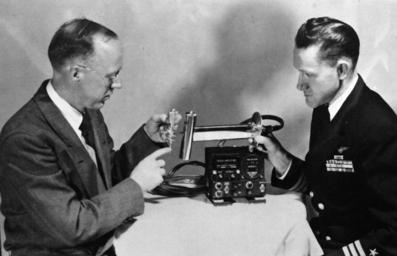 | Keywords: blackandwhite monochrome indoor black and white 330-PS-2497 (USN 708510): The spiral vane which produces a whirling motion in a new vortex thermometer, permitting correct measurement of air temperatures in aircraft flying at speeds up to 500 miles per hour, is pointed out to Commander F.P. Anderson by Mr. R.E. Ruskin, of the Naval Research Laboratory. Lowered pressure at the center of this vortex produces a cooling effect that offsets the heating effect produced on the surrounding air by the plane’s flight. Photograph released February 1, 1952. (5/26/2015). 330-PS-2497 (USN 708510): The spiral vane which produces a whirling motion in a new vortex thermometer, permitting correct measurement of air temperatures in aircraft flying at speeds up to 500 miles per hour, is pointed out to Commander F.P. Anderson by Mr. R.E. Ruskin, of the Naval Research Laboratory. Lowered pressure at the center of this vortex produces a cooling effect that offsets the heating effect produced on the surrounding air by the plane’s flight. Photograph released February 1, 1952. (5/26/2015). |