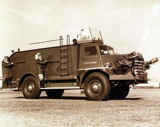 | Keywords: vehicle truck car outdoor 330-PS-3097 (USN 708766):  New Navy Foam Fire-Fighting Truck.   Mounted on a conventional crash truck, a new aircraft crash fire-extinguishing system, developed by the Naval Research Laboratory, under the sponsorship of the Bureau of Aeronautics, produces twice as much foam as previous systems.   It can cover a burning airplane with approximately 15,000 gallons of a thick sticky fire-smothering blanket of foam supplied by two pumps on the truck.   The improved system is the result of the new designs in nozzles and pumps with two 150-hp engines to power two separate foam-making systems.  Air, water, and foam concentrate are whipped together in egg-beater fashion, and the resulting micro-bubbled foam is fleeced out through two distributing nozzles on the front fenders of the truck. These nozzles are pivoted and continuously adjustable by the operator from his position on a “bridge” above and behind the cab of the truck.  By pushing a button the operator can widen his foam streams, operating a protective cone of 7,000 gallons of a foam a minute.  Tanks hold 1200 gallons of water and 80 gallons of foam concentrate sufficiently for two minutes of continuous, high-capacity operation, November 10, 1952.  (5/5/2015).  330-PS-3097 (USN 708766):  New Navy Foam Fire-Fighting Truck.   Mounted on a conventional crash truck, a new aircraft crash fire-extinguishing system, developed by the Naval Research Laboratory, under the sponsorship of the Bureau of Aeronautics, produces twice as much foam as previous systems.   It can cover a burning airplane with approximately 15,000 gallons of a thick sticky fire-smothering blanket of foam supplied by two pumps on the truck.   The improved system is the result of the new designs in nozzles and pumps with two 150-hp engines to power two separate foam-making systems.  Air, water, and foam concentrate are whipped together in egg-beater fashion, and the resulting micro-bubbled foam is fleeced out through two distributing nozzles on the front fenders of the truck. These nozzles are pivoted and continuously adjustable by the operator from his position on a “bridge” above and behind the cab of the truck.  By pushing a button the operator can widen his foam streams, operating a protective cone of 7,000 gallons of a foam a minute.  Tanks hold 1200 gallons of water and 80 gallons of foam concentrate sufficiently for two minutes of continuous, high-capacity operation, November 10, 1952.  (5/5/2015).   |