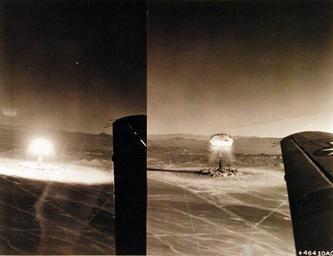 Keywords: minimalism monochrome 330-PS-3256 (46410 AC): These two aerial views of an atomic explosion were photographed from a U.S. Air Force observer aircraft during one of the continental nuclear tests, conducted over the past two years by the Atomic Energy Commission in the Nevada desert in which Department of Defense participated. U.S. Air Force aircraft not only delivered the weapon to ground zero, but also monitored the whole test area with observer aircraft who perform many duties. These duties include cloud tracking, camera ships, cloud sampling aircraft and other technical aircraft with specific scientific missions. Photograph released March 16, 1953. (5/5/2015). 330-PS-3256 (46410 AC): These two aerial views of an atomic explosion were photographed from a U.S. Air Force observer aircraft during one of the continental nuclear tests, conducted over the past two years by the Atomic Energy Commission in the Nevada desert in which Department of Defense participated. U.S. Air Force aircraft not only delivered the weapon to ground zero, but also monitored the whole test area with observer aircraft who perform many duties. These duties include cloud tracking, camera ships, cloud sampling aircraft and other technical aircraft with specific scientific missions. Photograph released March 16, 1953. (5/5/2015). |