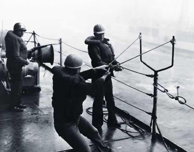 Keywords: outdoor monochrome 330-PSA-180-63 (USN 711337): The Latest in Modern Warfare – a Slingshot? Earl Larson, Boatswain’s Mate Third Class, USN, fires one of the attack aircraft carrier Shangri-La’s (CV 38) five slingshots to the fleet oiler Caloosahatchee (AO 98) during refueling operations off Newfoundland. The slingshots, after a brief test and evaluation phase, became operational equipment aboard Shangri-La in February of this year. They are used to throw lines from the carrier to other ships for refueling and replenishment. The lines were previously fired from a 45/70 caliber line-throwing gun, but the method is considered dangerous. If the line struck a man on the receiving ship, it could cause serious injury. While the firing force of the slingshot is sufficient to send the shot-line across, it does not have the power to injure personnel. The Shangri-La’s slingshots are made of solid steel and measure 36 inches in length and 17 inches between prongs. Mounted in the hollow of a lifeline stanchion, the slingshot can fire a line up to 200 feet. Photograph released August 25, 1963. (2015/10/20). 330-PSA-180-63 (USN 711337): The Latest in Modern Warfare – a Slingshot? Earl Larson, Boatswain’s Mate Third Class, USN, fires one of the attack aircraft carrier Shangri-La’s (CV 38) five slingshots to the fleet oiler Caloosahatchee (AO 98) during refueling operations off Newfoundland. The slingshots, after a brief test and evaluation phase, became operational equipment aboard Shangri-La in February of this year. They are used to throw lines from the carrier to other ships for refueling and replenishment. The lines were previously fired from a 45/70 caliber line-throwing gun, but the method is considered dangerous. If the line struck a man on the receiving ship, it could cause serious injury. While the firing force of the slingshot is sufficient to send the shot-line across, it does not have the power to injure personnel. The Shangri-La’s slingshots are made of solid steel and measure 36 inches in length and 17 inches between prongs. Mounted in the hollow of a lifeline stanchion, the slingshot can fire a line up to 200 feet. Photograph released August 25, 1963. (2015/10/20). |