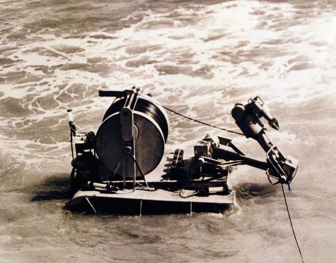Keywords: outdoor 330-PSA-34-60-1: Navy Reveals New Remote Control Undersea Vehicle for Exploring Ocean Bottom. A unique remote control undersea vehicle for exploring and conducting scientific studies of the ocean bottom for prolonged periods at great depths has been developed for the Office of Naval Research. The new vehicle was demonstrated for news media off the shore of La Jolla, California, May 16, 1960. Dubbed “RUM” for remote underwater manipulator, the vehicle is essentially a tank equipped with a long, jointed manipulator arm and hand together with specially devised underwater television cameras which serve as the eyes of the vehicle’s operator on shore. The development of the remote underwater manipulator was directed by Dr. Victor Anderson of the Marine Physical Laboratory of the Scripps Institution of Oceanography of the University of California at La Jolla for use in cooperation with the Hudson Laboratories of Columbia University. The goal of the Navy RUM development is to have available a vehicle capable of performing controlled-work functions in the oceanographic research. This includes observation of the sea floor, the collection of samples and specimens, and the assembly and installation of deep bottom-mounted instrumentation in the ocean. RUM can operate at depths down to 20,000 feet, maintaining a speed of 3 miles per hour where level bottom soil conditions permit. It can maneuver and operate on grades of 60 percent and is capable of climbing a vertical obstacle 12 inches in height. Photograph released May 17, 1960. (8/25/2015). 330-PSA-34-60-1: Navy Reveals New Remote Control Undersea Vehicle for Exploring Ocean Bottom. A unique remote control undersea vehicle for exploring and conducting scientific studies of the ocean bottom for prolonged periods at great depths has been developed for the Office of Naval Research. The new vehicle was demonstrated for news media off the shore of La Jolla, California, May 16, 1960. Dubbed “RUM” for remote underwater manipulator, the vehicle is essentially a tank equipped with a long, jointed manipulator arm and hand together with specially devised underwater television cameras which serve as the eyes of the vehicle’s operator on shore. The development of the remote underwater manipulator was directed by Dr. Victor Anderson of the Marine Physical Laboratory of the Scripps Institution of Oceanography of the University of California at La Jolla for use in cooperation with the Hudson Laboratories of Columbia University. The goal of the Navy RUM development is to have available a vehicle capable of performing controlled-work functions in the oceanographic research. This includes observation of the sea floor, the collection of samples and specimens, and the assembly and installation of deep bottom-mounted instrumentation in the ocean. RUM can operate at depths down to 20,000 feet, maintaining a speed of 3 miles per hour where level bottom soil conditions permit. It can maneuver and operate on grades of 60 percent and is capable of climbing a vertical obstacle 12 inches in height. Photograph released May 17, 1960. (8/25/2015). |