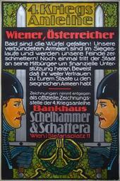 | Keywords: 3-2 Sammlung Eybl (Slg.Nr. 2268) Plakat 4. Kriegsanleihe 1916.jpg  Ă–sterreich “ Ungarn Anonym 4 Kriegsanleihe 1916 121 x 80 cm Slg Nr 2268 Der euphorische Text fordert die BĂĽrger der Heimat auf noch einmal den Staat finanziell zu unterstĂĽtzen und in den Sieg zu vertrauen Bis zur tatsächlichen Niederlage vergingen noch zwei Jahre und folgten vier weitere Kriegsanleihen Die Ritter an den Plakatseiten sollten das Bild eines žritterlichen Krieges erzeugen Diese oft verwendeten Symbole waren eine bewusste IrrefĂĽhrung Austria-Hungary Anonymous 4 War Bond 121 x 80 cm 1916 Slg Nr 2268 The euphoric text calls on the citizens of the homeland once again to support the government financially and to trust in the victory Until the actual defeat took another two years and was followed by four more war bonds The Knights of the poster sides should create the image of a chivalrous war These symbols often used were a deliberate deception Sammlung Eybl Plakatmuseum Wien 2009-11-28 12 45 58 A Erhardt Credit line Eybl Plakatmuseum Wien/Wikimedia Commons CC-BY-SA-4 0 wiki Sammlung Eybl Plakatmuseum Wien PD-old-100-1923 World War I posters of Austria-Hungary War bonds Plakatmuseum Wien Eybl Collection |