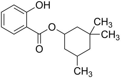| Keywords: 3,3,5-trimethylcyclohexyl 2-hydroxybenzoate 200.svg  validSVG Structure of 3 3 5-trimethylcyclohexyl 2-hydroxybenzoate Own 2014-03-29 Emeldir <span class signature-talk >talk</span> Chemical structure verified https //upload wikimedia org/wikipedia/commons/4/46/3 2C3 2C5-trimethylcyclohexyl_2-hydroxybenzoate_200 svg 1S/C16H22O3/c1-11-8-12 10-16 2 3 9-11 19-15 18 13-6-4-5-7-14 13 17/h4-7 11-12 17H 8-10H2 1-3H3 WSSJONWNBBTCMG-UHFFFAOYSA-N 118-56-9 204-260-8 Synonyms <small>2-Hydroxybenzoic acid 3 3 5-trimethylcyclohexyl ester 3 3 5-Trimethylcyclohexyl salicylate Cyclohexanol 3 3 5-trimethyl- salicylate Heliophan Homomenthyl salicylate Homosalate Salicylic acid 3 3 5-trimethylcyclohexyl ester Trimethylcyclohenyl salicylate</small> PD-chem Sunscreening agents Salicylate esters Cyclohexane derivatives  |