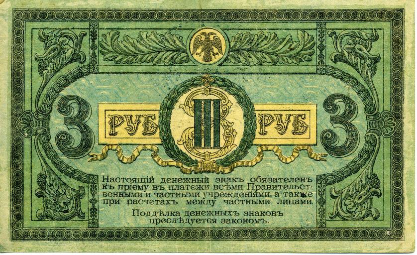 Keywords: Донские деньги - 3 рубля реверс 1918. Ростов.jpg en Russian Don banknote 3 rubles 1918 year Back ru Банкнота Донской области достоинством 3 убля об азца 1918 года scanned note from own personal collection П авительство Донской области/Ростовская конто а Госбанка 1918 1918 currency Banknotes of Don 1918 Banknotes with a face value of 3 Green banknotes |