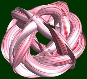 Keywords: mathematica 3d cg parametricplot3d texture torus 輪環 りんかん ドーナツ どーなつ 七芒星 しちぼうせい 七光星 しちこうせい 七稜星 しちりょうせい program プログラム code コード algorithm コード アルゴリズム geometric sculpture geometricsculpture shape geometry sculpture mapping テクスチャ マッピング 模様 もよう design pattern デザイン パターン graphic グラフィック グラフィクス structure 意匠 構造 symmetry 対称性 たいしょうせい シンメトリー 対称 たいしょう algorithm bright pastel SetOptions[ParametricPlot3D, PlotRange -> Full, Mesh -> None, Boxed -> False, Axes -> None, PlotPoints -> 400, ImageSize -> 3000, Background -> Darker[Green, 0.8], PlotStyle -> Directive[Specularity[White, 30], Texture[Import["D:/tmp/86.jpg"]]], TextureCoordinateFunction -> ({#4 + #5, #5/Pi} &), Lighting -> "Neutral"]; a = 5; (* center hole size of a torus *) b = 7; (* hepta-torus *) d = 3; (* number of torus *) v = 3; w = 0.5; x = (a - Cos[w t] - Sin[b s]) Cos[v s]; y = Sin[w t] Cos[b s]; z = (a - Cos[w t] - Sin[b s]) Sin[v s]; rot = Table[{x, y, z}.RotationMatrix[2 i Pi/d, {1, 1, 1}], {i, d}]; ParametricPlot3D[rot, {t, 0, 2 Pi}, {s, 0, 2 Pi}] (*--- The Texture *) SetOptions[ParametricPlot3D, PlotRange -> Full, Mesh -> None, Boxed -> False, Axes -> None, PlotPoints -> 400, ImageSize -> 3000, Background -> Darker[Green, 0.8], PlotStyle -> Directive[Specularity[White, 30], Texture[Import["D:/tmp/86.jpg"]]], TextureCoordinateFunction -> ({#4 + #5, #5/Pi} &), Lighting -> "Neutral"]; a = 5; (* center hole size of a torus *) b = 7; (* hepta-torus *) d = 3; (* number of torus *) v = 3; w = 0.5; x = (a - Cos[w t] - Sin[b s]) Cos[v s]; y = Sin[w t] Cos[b s]; z = (a - Cos[w t] - Sin[b s]) Sin[v s]; rot = Table[{x, y, z}.RotationMatrix[2 i Pi/d, {1, 1, 1}], {i, d}]; ParametricPlot3D[rot, {t, 0, 2 Pi}, {s, 0, 2 Pi}] (*--- The Texture *) |