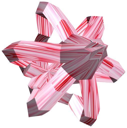 | Keywords: mathematica 3d cg parametricplot3d texture torus 輪環 りんかん ドーナツ どーなつ 五芒星 ごぼうせい 五光星 ごこうせい 五稜星 ごりょうせい program プログラム code コード algorithm コード アルゴリズム pentagram geometric sculpture geometricsculpture shape geometry sculpture mapping テクスチャ マッピング 模様 もよう design pattern デザイン パターン graphic グラフィック グラフィクス structure 意匠 構造 symmetry 対称性 たいしょうせい シンメトリー 対称 たいしょう algorithm white background illustration flower plant SetOptions[ParametricPlot3D, PlotRange -> Full, Mesh -> None, Boxed -> False, Axes -> None, PlotPoints -> 300, ImageSize -> 3000, PlotStyle -> Directive[Specularity[White, 30], Texture[Import["D:/tmp/86.jpg"]]], TextureCoordinateFunction -> ({#4 + #5, #5/Pi} &), Lighting -> "Neutral"]; a = 6;(* center hole size of a torus *) b = 5;(* penta-torus *) d = 3;(* number of torus *) f[v_] := TriangleWave[{-1, 1}, v]; g[v_] := TriangleWave[{-1, 1}, v + 1/4]; x = (a - g[t] - f[b s]) g[s + 1/(2 b)]; y = f[t]; z = (a - g[t] - f[b s]) f[s + 1/(2 b)]; rot = Table[{x, y, z}.RotationMatrix[2 i Pi /d, {0, 0, 1}], {i, d}]; ParametricPlot3D[rot, {t, 0, 1}, {s, 0, 1}] (* --- The Texture *) SetOptions[ParametricPlot3D, PlotRange -> Full, Mesh -> None, Boxed -> False, Axes -> None, PlotPoints -> 300, ImageSize -> 3000, PlotStyle -> Directive[Specularity[White, 30], Texture[Import["D:/tmp/86.jpg"]]], TextureCoordinateFunction -> ({#4 + #5, #5/Pi} &), Lighting -> "Neutral"]; a = 6;(* center hole size of a torus *) b = 5;(* penta-torus *) d = 3;(* number of torus *) f[v_] := TriangleWave[{-1, 1}, v]; g[v_] := TriangleWave[{-1, 1}, v + 1/4]; x = (a - g[t] - f[b s]) g[s + 1/(2 b)]; y = f[t]; z = (a - g[t] - f[b s]) f[s + 1/(2 b)]; rot = Table[{x, y, z}.RotationMatrix[2 i Pi /d, {0, 0, 1}], {i, d}]; ParametricPlot3D[rot, {t, 0, 1}, {s, 0, 1}] (* --- The Texture *) |