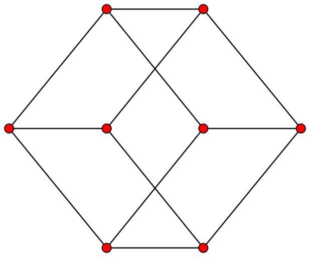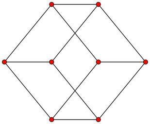 | Keywords: 3-cube column graph.svg  3-hypercube cube graph This hypercube graph is an orthogonal projection This oriented projection shows columns of vertices positioned a vertex-edge-vertex distance from one vertex on the left to one vertex on the right and edges attaching adjacent columns of vertices The number of vertices in each column represents rows in Pascal's triangle being 1 3 3 1 in the case of a 3-cube cube own Geoff Richards Qef 2008-07-23 Old bitmap version en Image 3-cube column graph gif Source code See en User Qef/Orthographic hypercube diagrams Qef Hypercube graphs 3 Cube 2-fold rotational symmetry Geometry images with dihedral symmetry 02 |