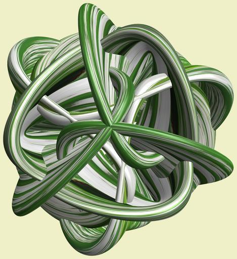 Keywords: mathematica 3d cg parametricplot3d texture torus code program algorithm プログラム コード アルゴリズム 輪環 りんかん ドーナツ どーなつ トーラス とーらす knot 結び目 むすびめ mapping テクスチャ マッピング 模様 もよう design pattern デザイン パターン graphic グラフィック グラフィクス structure 意匠 構造 symmetry 対称性 たいしょうせい シンメトリー 対称 たいしょう white background indoor cable a = 6; (* center hole size of a torus *) b1 = 5;(* the number of angles *) b2 = 2;(* the number of waves *) b3 = 3; (* the number of knots *) c = 5; (* distance from the center of rotation *) d = 3; (* the number of tori *) h1 = 5; (* width of a torus *) h2 = 2; (* width of a torus *) h3 = 7; (* height of cross *) SetOptions[ParametricPlot3D, PlotRange -> Full, Mesh -> None, Boxed -> False, Axes -> None, PlotPoints -> 500, ImageSize -> 3000, Background -> RGBColor[{240, 240, 200}/255], PlotStyle -> Directive[Specularity[White, 50], Texture[Import["D:/tmp/911.jpg"]]], TextureCoordinateFunction -> ({#4, #5 /Pi} &), Lighting -> "Neutral"]; x = (a - h1 Cos[t] + h2 Sin[b1 s]) Cos[b3 s] + c; y = (a - h1 Cos[t] + h2 Sin[b1 s]) Sin[b3 s] + c; z = h3 Cos[b1 s] + Sin[b2 t] + c; rm = Table[{x, y, z}.RotationMatrix[2 i Pi/d, {1, 1, 0}], {i, d}]; ParametricPlot3D[rm, {t, 0, 2 Pi}, {s, 0, 2 Pi}] (*--- The Texture Another shapes and colors *) a = 6; (* center hole size of a torus *) b1 = 5;(* the number of angles *) b2 = 2;(* the number of waves *) b3 = 3; (* the number of knots *) c = 5; (* distance from the center of rotation *) d = 3; (* the number of tori *) h1 = 5; (* width of a torus *) h2 = 2; (* width of a torus *) h3 = 7; (* height of cross *) SetOptions[ParametricPlot3D, PlotRange -> Full, Mesh -> None, Boxed -> False, Axes -> None, PlotPoints -> 500, ImageSize -> 3000, Background -> RGBColor[{240, 240, 200}/255], PlotStyle -> Directive[Specularity[White, 50], Texture[Import["D:/tmp/911.jpg"]]], TextureCoordinateFunction -> ({#4, #5 /Pi} &), Lighting -> "Neutral"]; x = (a - h1 Cos[t] + h2 Sin[b1 s]) Cos[b3 s] + c; y = (a - h1 Cos[t] + h2 Sin[b1 s]) Sin[b3 s] + c; z = h3 Cos[b1 s] + Sin[b2 t] + c; rm = Table[{x, y, z}.RotationMatrix[2 i Pi/d, {1, 1, 0}], {i, d}]; ParametricPlot3D[rm, {t, 0, 2 Pi}, {s, 0, 2 Pi}] (*--- The Texture Another shapes and colors *)