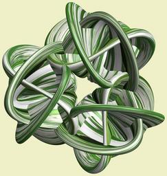 Keywords: mathematica 3d cg parametricplot3d texture torus code program algorithm プログラム コード アルゴリズム 輪環 りんかん ドーナツ どーなつ トーラス とーらす knot 結び目 むすびめ mapping テクスチャ マッピング 模様 もよう design pattern デザイン パターン graphic グラフィック グラフィクス structure 意匠 構造 symmetry 対称性 たいしょうせい シンメトリー 対称 たいしょう white background a = 6; (* center hole size of a torus *) b1 = 5;(* the number of angles *) b2 = 2;(* the number of waves *) b3 = 3; (* the number of knots *) c = 10; (* distance from the center of rotation *) d = 3; (* the number of tori *) h1 = 5; (* width of a torus *) h2 = 2; (* width of a torus *) h3 = 7; (* height of cross *) SetOptions[ParametricPlot3D, PlotRange -> Full, Mesh -> None, Boxed -> False, Axes -> None, PlotPoints -> 500, ImageSize -> 3000, Background -> RGBColor[{240, 240, 200}/255], PlotStyle -> Directive[Specularity[White, 50], Texture[Import["D:/tmp/911.jpg"]]], TextureCoordinateFunction -> ({#4, #5 /Pi} &), Lighting -> "Neutral"]; x = (a - h1 Cos[t] + h2 Sin[b1 s]) Cos[b3 s] + c; y = (a - h1 Cos[t] + h2 Sin[b1 s]) Sin[b3 s] + c; z = h3 Cos[b1 s] + Sin[b2 t] + c; rm = Table[{x, y, z}.RotationMatrix[2 i Pi/d, {1, 1, 0}], {i, d}]; ParametricPlot3D[rm, {t, 0, 2 Pi}, {s, 0, 2 Pi}] (*--- The Texture Another shapes and colors *) a = 6; (* center hole size of a torus *) b1 = 5;(* the number of angles *) b2 = 2;(* the number of waves *) b3 = 3; (* the number of knots *) c = 10; (* distance from the center of rotation *) d = 3; (* the number of tori *) h1 = 5; (* width of a torus *) h2 = 2; (* width of a torus *) h3 = 7; (* height of cross *) SetOptions[ParametricPlot3D, PlotRange -> Full, Mesh -> None, Boxed -> False, Axes -> None, PlotPoints -> 500, ImageSize -> 3000, Background -> RGBColor[{240, 240, 200}/255], PlotStyle -> Directive[Specularity[White, 50], Texture[Import["D:/tmp/911.jpg"]]], TextureCoordinateFunction -> ({#4, #5 /Pi} &), Lighting -> "Neutral"]; x = (a - h1 Cos[t] + h2 Sin[b1 s]) Cos[b3 s] + c; y = (a - h1 Cos[t] + h2 Sin[b1 s]) Sin[b3 s] + c; z = h3 Cos[b1 s] + Sin[b2 t] + c; rm = Table[{x, y, z}.RotationMatrix[2 i Pi/d, {1, 1, 0}], {i, d}]; ParametricPlot3D[rm, {t, 0, 2 Pi}, {s, 0, 2 Pi}] (*--- The Texture Another shapes and colors *)