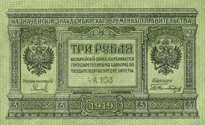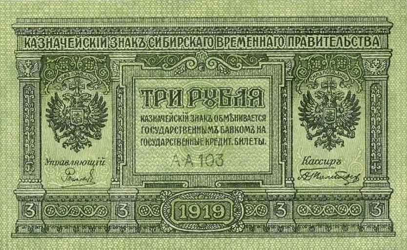 | Keywords: 3 rub Kolchak.jpg  п авительством Колчака аве с И кутский областной к аеведческий музей Российское п авительство 1919 PD-Old-70 currency Banknotes of Siberian Provisional Government Green banknotes Banknotes with a face value of 3 Banknotes of Russia 1919 |
