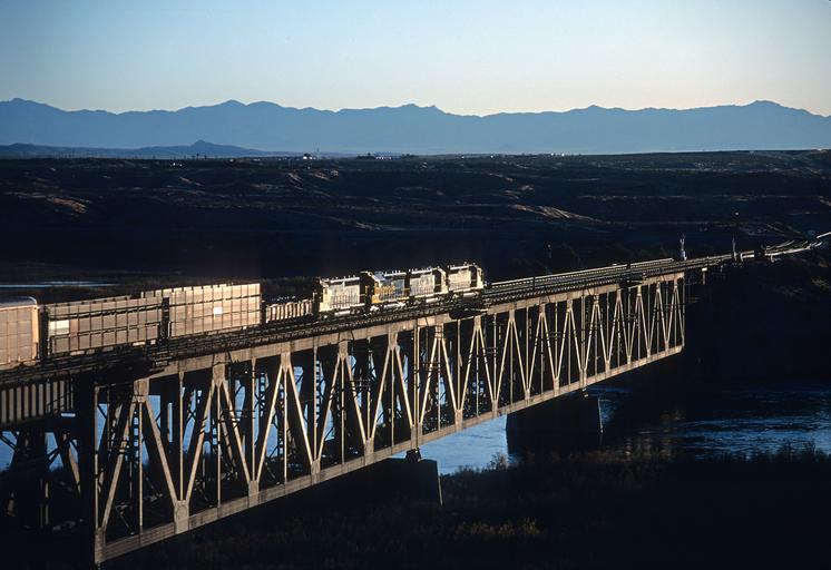 | Keywords: santa fe santafe outdoor architecture bridge pier water building structure building infrastructure waterfront These are 5 of Roger Puta's photographs of 3 Santa Fe freights crossing the Colorado River bridge and the Arizona-California border at Topock, AZ in February 1984. The sun was a little higher for the third train. These are 5 of Roger Puta's photographs of 3 Santa Fe freights crossing the Colorado River bridge and the Arizona-California border at Topock, AZ in February 1984. The sun was a little higher for the third train. These are 5 of Roger Puta's photographs of 3 Santa Fe freights crossing the Colorado River bridge and the Arizona-California border at Topock, AZ in February 1984.