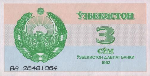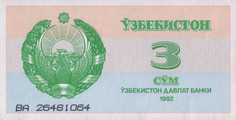 | Keywords: 3 som. Uzbekistan, 1992 a.jpg  3 сум Узбекистана 1992 3 sum of Uzbekistan 1992 own scan 1992 Central Bank of the Republic of Uzbekistan Цент альный банк Республики Узбекистан Ўзбекистон Республикаси  а казий банки PD-UZ-exempt banknotes  Banknotes of Uzbekistan 1992 Banknotes with a face value of 3 Coats of arms of Uzbekistan on banknotes |
