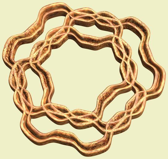 | Keywords: mathematica 3d cg parametricplot3d texture torus code program algorithm プログラム コード アルゴリズム 輪環 りんかん ドーナツ どーなつ トーラス とーらす geometric sculpture geometricsculpture shape geometry sculpture mapping テクスチャ マッピング 模様 もよう design pattern デザイン パターン graphic グラフィック グラフィクス structure 意匠 構造 symmetry 対称性 たいしょうせい シンメトリー 対称 たいしょう indoor ancient drawing surreal tangle a = 10; (* center hole size of a torus *) b1 = 6;(* number of angle *) b2 = 2;(* number of wave *) c = 2; (* distance from the center of rotation *) d = 3; (* number of torus *) SetOptions[ParametricPlot3D, PlotRange -> Full, Mesh -> None, Boxed -> False, Axes -> None, PlotPoints -> 500, ImageSize -> 3000, Background -> RGBColor[{240, 240, 200}/255], PlotStyle -> Directive[Specularity[White, 70], Texture[Import["D:/tmp/96.jpg"]]], TextureCoordinateFunction -> ({#4, #5 Pi} &), Lighting -> "Neutral"]; f[v_] := Sin[2 Sin[Sin[Sin[v]]]]; x = (a - Cos[t] + f[b1 s]) Cos[s] + c; y = (a - Cos[t] + f[b1 s]) Sin[s] + c; z = f[b2 t]; rm = Table[{x, y, z}.RotationMatrix[2 i Pi/d, {0, 0, 1}], {i, d}]; ParametricPlot3D[rm, {t, 0, 2 Pi}, {s, 0, 2 Pi}] (*--- The Texture *) a = 10; (* center hole size of a torus *) b1 = 6;(* number of angle *) b2 = 2;(* number of wave *) c = 2; (* distance from the center of rotation *) d = 3; (* number of torus *) SetOptions[ParametricPlot3D, PlotRange -> Full, Mesh -> None, Boxed -> False, Axes -> None, PlotPoints -> 500, ImageSize -> 3000, Background -> RGBColor[{240, 240, 200}/255], PlotStyle -> Directive[Specularity[White, 70], Texture[Import["D:/tmp/96.jpg"]]], TextureCoordinateFunction -> ({#4, #5 Pi} &), Lighting -> "Neutral"]; f[v_] := Sin[2 Sin[Sin[Sin[v]]]]; x = (a - Cos[t] + f[b1 s]) Cos[s] + c; y = (a - Cos[t] + f[b1 s]) Sin[s] + c; z = f[b2 t]; rm = Table[{x, y, z}.RotationMatrix[2 i Pi/d, {0, 0, 1}], {i, d}]; ParametricPlot3D[rm, {t, 0, 2 Pi}, {s, 0, 2 Pi}] (*--- The Texture *) |
