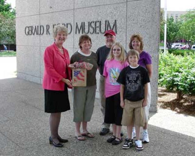 Keywords: 3million2a400 NLGRF photo (2008-06-17)(Gerald Ford Library).jpg Gerald R Ford Library and Museum Director Elaine Didier at the Museum on June 17 2008 with the three millionth visitor Cindy Lund Cindy Lund in green was given an autographed copy of President Ford's autobiography Didier arranged for Susan Bales Ford and Steven Ford to call Lund to congratulate her Also photographed are Steve Lund Connie Dieleman and her children Angela and Daniel Event Three Millionth Visitor Location Gerald R Ford Museum Grand Rapids Michigan Date June 17 2008 Credit Courtesy Gerald R Ford Museum Rights Information Public Domain No usage fees no permission required 2008-06-17 Gerald R Ford Presidential Library Image http //www fordlibrarymuseum gov/photogallery/photo 20gallery 20images/3millionth1 html 3millionth1 html as from http //www fordlibrarymuseum gov/photogallery/3millionthvisitor asp 3millionthvisitor asp Courtesy Gerald R Ford Museum PD-USGov Institution Institution Gerald R Ford Presidential Library Elaine Didier Gerald R Ford Presidential Museum building |