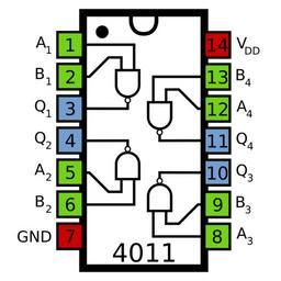Keywords: 4011 Pinout.svg en Pinout Diagram of the 4011 Quad 2-Input NAND gate CMOS IC own Inductiveload 2008-12-22 IC pinout diagrams 4000 Series