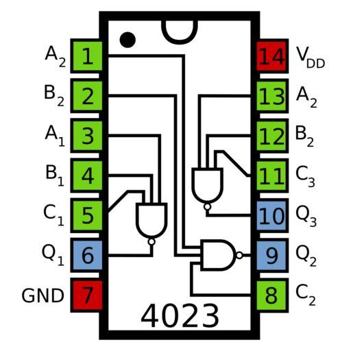 Keywords: 4023 Pinout.svg en Pinout diagram of the 4023 triple NAND gate logic IC own Inductiveload 2009-09-21 IC pinout diagrams NAND gates