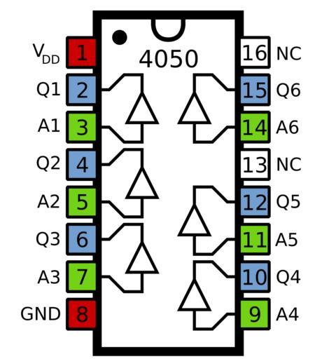 MAKE A MEME View Large Image 4050 Pinout.svg en Pinout diagram of the 4050 hex non-inverting buffer IC own Inductiveload 2009-02-21 IC pinout diagrams YES gates 4050 number