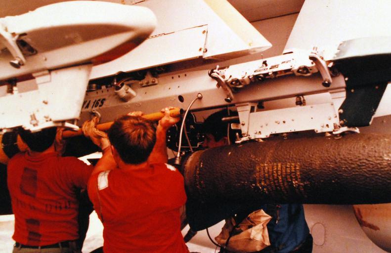 Keywords: 428-GX-K-120863: Attack Squadron 165 (VA-165), Ordnance Crewmen hang 500 pound bombs on racks of a squadron A-7E “Corsair II” attack aircraft on the flight deck of USS Constellation (CV 64) while in the Pacific Ocean. Photographed by PH1 William C. Wickham, August 1978. U.S. Navy photograph, now in the collections of the National Archives. (2015/12/15). 428-GX-K-120863: Attack Squadron 165 (VA-165), Ordnance Crewmen hang 500 pound bombs on racks of a squadron A-7E “Corsair II” attack aircraft on the flight deck of USS Constellation (CV 64) while in the Pacific Ocean. Photographed by PH1 William C. Wickham, August 1978. U.S. Navy photograph, now in the collections of the National Archives. (2015/12/15). |