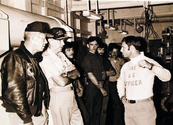 | Keywords: 428-GX-USN 1175249: Mediterranean Sea. Arresting Gear Officer of USS Dwight D. Eisenhower (CVN 69), (right), explains the operation of equipment in his division for Secretary of the Navy W. Graham Claytor, Jr., second from left, and Rear Admiral Robert F. Schoultz, Commander, Carrier Strike Force, Sixth Fleet, during a tour of the carrier. Photographed by PH3 Gary H. Ford, July 15, 1979. Official U.S. Navy photograph, now in the collections of the National Archives. (2016/07/19). 428-GX-USN 1175249: Mediterranean Sea. Arresting Gear Officer of USS Dwight D. Eisenhower (CVN 69), (right), explains the operation of equipment in his division for Secretary of the Navy W. Graham Claytor, Jr., second from left, and Rear Admiral Robert F. Schoultz, Commander, Carrier Strike Force, Sixth Fleet, during a tour of the carrier. Photographed by PH3 Gary H. Ford, July 15, 1979. Official U.S. Navy photograph, now in the collections of the National Archives. (2016/07/19). |