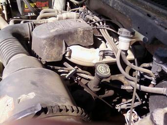 Keywords: 42LV6 driver side.jpg en 4 2 liter V6 engine installed in a 1998 F-150 Shows the left valve cover bank 2 the clutch fluid reservoir air cleaner throttle body coil pack and the master brake cylinder/reservoir own Shadow460 2009-05-09 Ford automobile engines Brake master cylinders