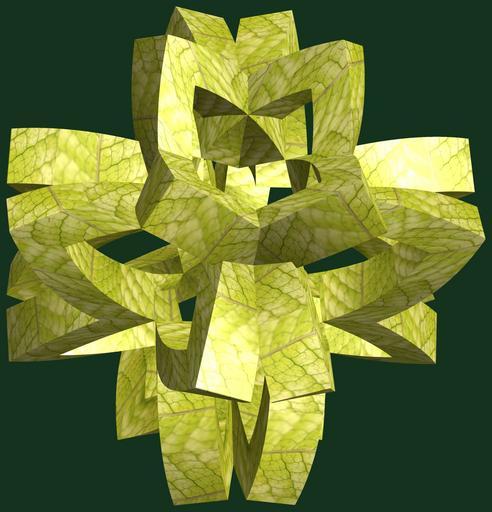 | Keywords: mathematica 3d cg parametricplot3d texture torus code program algorithm プログラム コード アルゴリズム 輪環 りんかん ドーナツ どーなつ 六芒星 ろくぼうせい geometric sculpture geometricsculpture shape geometry sculpture mapping テクスチャ マッピング 模様 もよう abstract 抽象 ちゅうしょう アブストラクト design pattern デザイン パターン graphic グラフィック グラフィクス structure 意匠 構造 symmetry 対称性 たいしょうせい シンメトリー 対称 たいしょう foliage plant leaf outdoor tree a = 4; (* center hole size *) b = 6; (* hexa-torus *) c = -2; (* distance from the center of rotation *) d = 4; (* number of torus *) h = 1; (* height of a torus *) SetOptions[ParametricPlot3D, PlotRange -> Full, Mesh -> None, Boxed -> False, Axes -> False, PlotPoints -> 400, ImageSize -> 3000, Background -> RGBColor[{20, 50, 30}/255], PlotStyle -> Directive[Specularity[White, 30], Texture[Import["D:/tmp/71.jpg"]]], TextureCoordinateFunction -> ({#4, #5 Pi} &), Lighting -> "Neutral"]; f[v_] := TriangleWave[{-1, 1}, v/(2 Pi)]; g[v_] := TriangleWave[{-1, 1}, v/(2 Pi) + 1/4]; x = (a - g[t] - f[b s]) Cos[s]; y = (a - g[t] - f[b s]) Sin[s]; z = (a - f[t] - h f[b s]) + c; rm = Table[{x, y, z}.RotationMatrix[2 i Pi/d, {1, 1, 0}], {i, d}]; ParametricPlot3D[rm, {t, 0, 2 Pi}, {s, 0, Pi}] (*--- The Texture *) a = 4; (* center hole size *) b = 6; (* hexa-torus *) c = -2; (* distance from the center of rotation *) d = 4; (* number of torus *) h = 1; (* height of a torus *) SetOptions[ParametricPlot3D, PlotRange -> Full, Mesh -> None, Boxed -> False, Axes -> False, PlotPoints -> 400, ImageSize -> 3000, Background -> RGBColor[{20, 50, 30}/255], PlotStyle -> Directive[Specularity[White, 30], Texture[Import["D:/tmp/71.jpg"]]], TextureCoordinateFunction -> ({#4, #5 Pi} &), Lighting -> "Neutral"]; f[v_] := TriangleWave[{-1, 1}, v/(2 Pi)]; g[v_] := TriangleWave[{-1, 1}, v/(2 Pi) + 1/4]; x = (a - g[t] - f[b s]) Cos[s]; y = (a - g[t] - f[b s]) Sin[s]; z = (a - f[t] - h f[b s]) + c; rm = Table[{x, y, z}.RotationMatrix[2 i Pi/d, {1, 1, 0}], {i, d}]; ParametricPlot3D[rm, {t, 0, 2 Pi}, {s, 0, Pi}] (*--- The Texture *) |