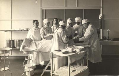 MAKE A MEME View Large Image English Format: Still image Subject(s): Hospitals, Military Operating Rooms Physicians King George Military Hospital. Genre(s): Postcards Abstract: Black and white photograph of surgeons and nurses tending to a patient on an operating table ...