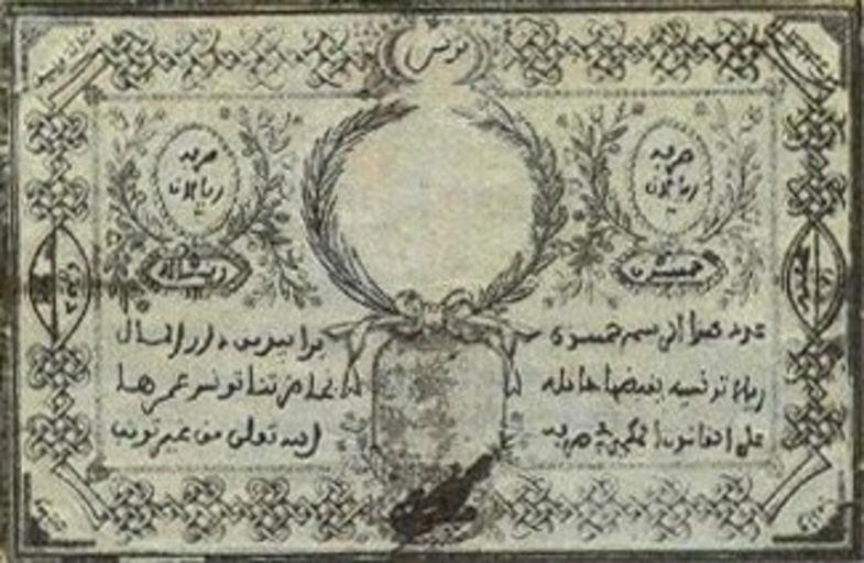 Keywords: 50 Tunisian Rial - 1847 - obverse.jpg en 50 Tunisian Rial banknote issued in 1847 the first Tunisian banknote own DrFO Jr Tn 2008 Tunisian rial banknotes Banknotes with a face value of 50