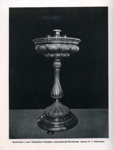 | View Original: | 53. Подсвечник у раки преподобного Серафима, пожертвованный московским купцом В. Г. Рыбаковым.jpg (751x986) | |||