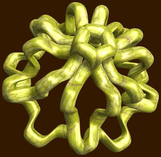 | Keywords: mathematica 3d cg parametricplot3d texture torus 輪環 りんかん ドーナツ どーなつ 六芒星 ろくぼうせい 六光星 ろくこうせい 六稜星 ろくりょうせい code program algorithm コード プログラム アルゴリズム hexagram geometric sculpture geometricsculpture shape geometry sculpture mapping テクスチャ マッピング 模様 もよう abstract 抽象 ちゅうしょう アブストラクト design pattern デザイン パターン graphic グラフィック グラフィクス structure 意匠 構造 symmetry 対称性 たいしょうせい シンメトリー 対称 たいしょう algorithm コード black background organic pattern indoor bright a = 7; (* center hole size of a torus *) b = 6; (* hexa-torus *) c = 0; (* distance from the center of rotation *) d = 5; (* number of torus *) h = 1; (* height of a torus *) SetOptions[ParametricPlot3D, PlotRange -> Full, Mesh -> None, Boxed -> False, Axes -> False, PlotPoints -> 400, ImageSize -> 3000, Background -> Darker[Orange, 0.8], PlotStyle -> Directive[Specularity[White, 30], Texture[Import["D:/tmp/71.jpg"]]], TextureCoordinateFunction -> ({#4 , #5 2 Pi} &), Lighting -> "Neutral"]; f[v_] := Sin[2 Sin[Sin[Sin[v]]]]; x = (a - Cos[t] - f[b s]) Cos[s] + c; y = (a - Cos[t] - f[b s]) Sin[s] + c; z = (a - Sin[t] - h f[b s]); rot = Table[{x, y, z}.RotationMatrix[2 i Pi/d, {1, 1, 1}], {i, d}]; ParametricPlot3D[rot, {t, 0, 2 Pi}, {s, 0, 2 Pi}] (*--- The Texture is this: www.flickr.com/photos/tanaka_juuyoh/5239255695/ *) a = 7; (* center hole size of a torus *) b = 6; (* hexa-torus *) c = 0; (* distance from the center of rotation *) d = 5; (* number of torus *) h = 1; (* height of a torus *) SetOptions[ParametricPlot3D, PlotRange -> Full, Mesh -> None, Boxed -> False, Axes -> False, PlotPoints -> 400, ImageSize -> 3000, Background -> Darker[Orange, 0.8], PlotStyle -> Directive[Specularity[White, 30], Texture[Import["D:/tmp/71.jpg"]]], TextureCoordinateFunction -> ({#4 , #5 2 Pi} &), Lighting -> "Neutral"]; f[v_] := Sin[2 Sin[Sin[Sin[v]]]]; x = (a - Cos[t] - f[b s]) Cos[s] + c; y = (a - Cos[t] - f[b s]) Sin[s] + c; z = (a - Sin[t] - h f[b s]); rot = Table[{x, y, z}.RotationMatrix[2 i Pi/d, {1, 1, 1}], {i, d}]; ParametricPlot3D[rot, {t, 0, 2 Pi}, {s, 0, 2 Pi}] (*--- The Texture is this: www.flickr.com/photos/tanaka_juuyoh/5239255695/ *) |