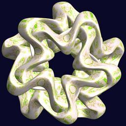 | Keywords: mathematica 3d cg parametricplot3d texture torus 輪環 りんかん ドーナツ どーなつ 六芒星 ろくぼうせい 六光星 ろくこうせい 六稜星 ろくりょうせい code program algorithm コード プログラム アルゴリズム hexagram geometric sculpture geometricsculpture shape geometry sculpture mapping テクスチャ マッピング 模様 もよう abstract 抽象 ちゅうしょう アブストラクト design pattern デザイン パターン graphic グラフィック グラフィクス structure 意匠 構造 symmetry 対称性 たいしょうせい シンメトリー 対称 たいしょう algorithm コード black background indoor food animal a = 5; (* center hole size of a torus *) b = 6; (* hexa-torus *) c = 1; (* distance from the center of rotation *) d = 5; (* number of torus *) h = 1; (* height of a torus *) SetOptions[ParametricPlot3D, PlotRange -> Full, Mesh -> None, Boxed -> False, Axes -> False, PlotPoints -> 400, ImageSize -> 3000, Background -> RGBColor[{10, 10, 40}/255], PlotStyle -> Directive[Specularity[White, 30], Texture[Import["D:/tmp/864.jpg"]]], TextureCoordinateFunction -> ({#4, #5 2 Pi} &), Lighting -> "Neutral"]; f[v_] := Sin[2 Sin[Sin[Sin[v]]]]; x = (a - Cos[t] - Sin[b s]) Cos[s + Pi/(2 b)] + c; y = (a - Cos[t] - Sin[b s]) Sin[s + Pi/(2 b)] + c; z = (f[t] - h f[b s]) + c; rot = Table[{x, y, z}.RotationMatrix[2 i Pi/d, {0, 1, 1}], {i, d}]; ParametricPlot3D[rot, {t, 0, 2 Pi}, {s, 0, 2 Pi}] (*--- The Texture *) a = 5; (* center hole size of a torus *) b = 6; (* hexa-torus *) c = 1; (* distance from the center of rotation *) d = 5; (* number of torus *) h = 1; (* height of a torus *) SetOptions[ParametricPlot3D, PlotRange -> Full, Mesh -> None, Boxed -> False, Axes -> False, PlotPoints -> 400, ImageSize -> 3000, Background -> RGBColor[{10, 10, 40}/255], PlotStyle -> Directive[Specularity[White, 30], Texture[Import["D:/tmp/864.jpg"]]], TextureCoordinateFunction -> ({#4, #5 2 Pi} &), Lighting -> "Neutral"]; f[v_] := Sin[2 Sin[Sin[Sin[v]]]]; x = (a - Cos[t] - Sin[b s]) Cos[s + Pi/(2 b)] + c; y = (a - Cos[t] - Sin[b s]) Sin[s + Pi/(2 b)] + c; z = (f[t] - h f[b s]) + c; rot = Table[{x, y, z}.RotationMatrix[2 i Pi/d, {0, 1, 1}], {i, d}]; ParametricPlot3D[rot, {t, 0, 2 Pi}, {s, 0, 2 Pi}] (*--- The Texture *) |