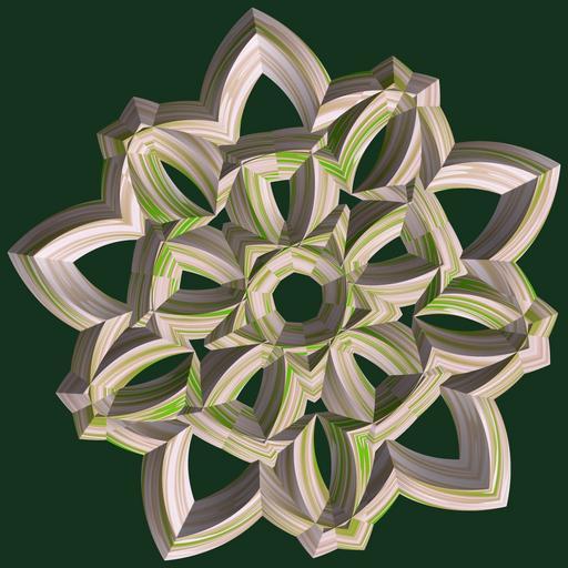 | Keywords: mathematica 3d cg parametricplot3d texture torus code program algorithm プログラム コード アルゴリズム 輪環 りんかん ドーナツ どーなつ 六芒星 ろくぼうせい geometric sculpture geometricsculpture shape geometry sculpture mapping テクスチャ マッピング 模様 もよう abstract 抽象 ちゅうしょう アブストラクト design pattern デザイン パターン graphic グラフィック グラフィクス structure 意匠 構造 symmetry 対称性 たいしょうせい シンメトリー 対称 たいしょう black background tangle a = 4; (* center hole size *) b = 6; (* hexa-torus *) c = 2; (* distance from the center of rotation *) d = 5; (* number of torus *) h = 0; (* height of a torus *) SetOptions[ParametricPlot3D, PlotRange -> Full, Mesh -> None, Boxed -> False, Axes -> False, PlotPoints -> 400, ImageSize -> 3000, Background -> RGBColor[{20, 50, 30}/255], PlotStyle -> Directive[Specularity[White, 40], Texture[Import["D:/tmp/862.jpg"]]], TextureCoordinateFunction -> ({#4 + #5, #5 / Pi} &), Lighting -> "Neutral"]; f[v_] := TriangleWave[{-1, 1}, v/(2 Pi)]; g[v_] := TriangleWave[{-1, 1}, v/(2 Pi) + 1/4]; x = (a - g[t] - f[b s]) Cos[s] + c; y = (a - g[t] - f[b s]) Sin[s] + c; z = (a - f[t] - h f[b s]); rm = Table[{x, y, z}.RotationMatrix[2 i Pi/d, {0, 0, 1}], {i, d}]; ParametricPlot3D[rm, {t, 0, 2 Pi}, {s, 0, Pi}] (*--- The Texture *) a = 4; (* center hole size *) b = 6; (* hexa-torus *) c = 2; (* distance from the center of rotation *) d = 5; (* number of torus *) h = 0; (* height of a torus *) SetOptions[ParametricPlot3D, PlotRange -> Full, Mesh -> None, Boxed -> False, Axes -> False, PlotPoints -> 400, ImageSize -> 3000, Background -> RGBColor[{20, 50, 30}/255], PlotStyle -> Directive[Specularity[White, 40], Texture[Import["D:/tmp/862.jpg"]]], TextureCoordinateFunction -> ({#4 + #5, #5 / Pi} &), Lighting -> "Neutral"]; f[v_] := TriangleWave[{-1, 1}, v/(2 Pi)]; g[v_] := TriangleWave[{-1, 1}, v/(2 Pi) + 1/4]; x = (a - g[t] - f[b s]) Cos[s] + c; y = (a - g[t] - f[b s]) Sin[s] + c; z = (a - f[t] - h f[b s]); rm = Table[{x, y, z}.RotationMatrix[2 i Pi/d, {0, 0, 1}], {i, d}]; ParametricPlot3D[rm, {t, 0, 2 Pi}, {s, 0, Pi}] (*--- The Texture *) |