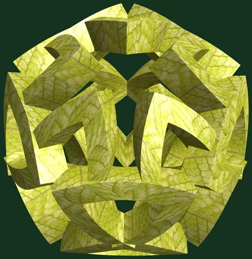 | Keywords: mathematica 3d cg parametricplot3d texture torus code program algorithm プログラム コード アルゴリズム 輪環 りんかん ドーナツ どーなつ 六芒星 ろくぼうせい geometric sculpture geometricsculpture shape geometry sculpture mapping テクスチャ マッピング 模様 もよう abstract 抽象 ちゅうしょう アブストラクト design pattern デザイン パターン graphic グラフィック グラフィクス structure 意匠 構造 symmetry 対称性 たいしょうせい シンメトリー 対称 たいしょう leaf plant foliage outdoor a = 4; (* center hole size *) b = 6; (* hexa-torus *) c = -7; (* distance from the center of rotation *) d = 5; (* number of torus *) h = 1; (* height of a torus *) SetOptions[ParametricPlot3D, PlotRange -> Full, Mesh -> None, Boxed -> False, Axes -> False, PlotPoints -> 400, ImageSize -> 3000, Background -> RGBColor[{20, 50, 30}/255], PlotStyle -> Directive[Specularity[White, 30], Texture[Import["D:/tmp/71.jpg"]]], TextureCoordinateFunction -> ({#4, #5 Pi} &), Lighting -> "Neutral"]; f[v_] := TriangleWave[{-1, 1}, v/(2 Pi)]; g[v_] := TriangleWave[{-1, 1}, v/(2 Pi) + 1/4]; x = (a - g[t] - f[b s]) Cos[s]; y = (a - g[t] - f[b s]) Sin[s]; z = (a - f[t] - h f[b s]) + c; rm = Table[{x, y, z}.RotationMatrix[2 i Pi/d, {1, 1, 0}], {i, d}]; ParametricPlot3D[rm, {t, 0, 2 Pi}, {s, 0, Pi}] (*--- The Texture *) a = 4; (* center hole size *) b = 6; (* hexa-torus *) c = -7; (* distance from the center of rotation *) d = 5; (* number of torus *) h = 1; (* height of a torus *) SetOptions[ParametricPlot3D, PlotRange -> Full, Mesh -> None, Boxed -> False, Axes -> False, PlotPoints -> 400, ImageSize -> 3000, Background -> RGBColor[{20, 50, 30}/255], PlotStyle -> Directive[Specularity[White, 30], Texture[Import["D:/tmp/71.jpg"]]], TextureCoordinateFunction -> ({#4, #5 Pi} &), Lighting -> "Neutral"]; f[v_] := TriangleWave[{-1, 1}, v/(2 Pi)]; g[v_] := TriangleWave[{-1, 1}, v/(2 Pi) + 1/4]; x = (a - g[t] - f[b s]) Cos[s]; y = (a - g[t] - f[b s]) Sin[s]; z = (a - f[t] - h f[b s]) + c; rm = Table[{x, y, z}.RotationMatrix[2 i Pi/d, {1, 1, 0}], {i, d}]; ParametricPlot3D[rm, {t, 0, 2 Pi}, {s, 0, Pi}] (*--- The Texture *) |