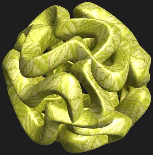 | Keywords: mathematica 3d cg parametricplot3d texture torus 輪環 りんかん ドーナツ どーなつ 五芒星 ごぼうせい 五光星 ごこうせい 五稜星 ごりょうせい code program algorithm コード プログラム アルゴリズム pentagram geometric sculpture geometricsculpture shape geometry sculpture mapping テクスチャ マッピング 模様 もよう abstract 抽象 ちゅうしょう アブストラクト design pattern デザイン パターン graphic グラフィック グラフィクス structure 意匠 構造 symmetry 対称性 たいしょうせい シンメトリー 対称 たいしょう algorithm コード indoor vegetable food black background a = 5; (* center hole size of a torus *) b = 5; (* penta-torus *) c = -8; (* distance from the center of rotation *) d = 5; (* number of torus *) h = 1; (* height of a torus *) SetOptions[ParametricPlot3D, PlotRange -> Full, Mesh -> None, Boxed -> False, Axes -> False, PlotPoints -> 400, ImageSize -> 3000, Background -> RGBColor[{30, 30, 30}/255], PlotStyle -> Directive[Specularity[White, 30], Texture[Import["D:/tmp/71.jpg"]]], TextureCoordinateFunction -> ({#4, #5 b Pi} &), Lighting -> "Neutral"]; f[v_] := Sin[2 Sin[Sin[Sin[v]]]]; x = (a - Cos[t] - Sin[b s]) Cos[s + Pi/b]; y = (a - Cos[t] - Sin[b s]) Sin[s + Pi/b]; z = (a - f[t] - h Sin[b s]) + c; rm = Table[{x, y, z}.RotationMatrix[2 i Pi/d, {1, 0, 0}], {i, d}]; ParametricPlot3D[rm, {t, 0, 2 Pi}, {s, 0, 2 Pi}] (*--- The Texture *) a = 5; (* center hole size of a torus *) b = 5; (* penta-torus *) c = -8; (* distance from the center of rotation *) d = 5; (* number of torus *) h = 1; (* height of a torus *) SetOptions[ParametricPlot3D, PlotRange -> Full, Mesh -> None, Boxed -> False, Axes -> False, PlotPoints -> 400, ImageSize -> 3000, Background -> RGBColor[{30, 30, 30}/255], PlotStyle -> Directive[Specularity[White, 30], Texture[Import["D:/tmp/71.jpg"]]], TextureCoordinateFunction -> ({#4, #5 b Pi} &), Lighting -> "Neutral"]; f[v_] := Sin[2 Sin[Sin[Sin[v]]]]; x = (a - Cos[t] - Sin[b s]) Cos[s + Pi/b]; y = (a - Cos[t] - Sin[b s]) Sin[s + Pi/b]; z = (a - f[t] - h Sin[b s]) + c; rm = Table[{x, y, z}.RotationMatrix[2 i Pi/d, {1, 0, 0}], {i, d}]; ParametricPlot3D[rm, {t, 0, 2 Pi}, {s, 0, 2 Pi}] (*--- The Texture *) |