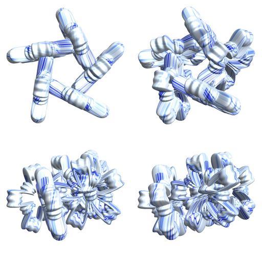 | Keywords: mathematica 3d cg parametricplot3d texture torus 輪環 りんかん ドーナツ どーなつ 五芒星 ごぼうせい 五光星 五稜星 ごこうせい ごりょうせい program プログラム code コード algorithm コード アルゴリズム pentagram geometric sculpture geometricsculpture shape geometry sculpture mapping テクスチャ マッピング 模様 もよう design pattern デザイン パターン graphic グラフィック グラフィクス structure 意匠 構造 symmetry 対称性 たいしょうせい シンメトリー 対称 たいしょう algorithm white background blossom plant SetOptions[ParametricPlot3D, PlotRange -> Full, Mesh -> None, Boxed -> False, Axes -> None, PlotPoints -> 300, ImageSize -> 900, PlotStyle -> Directive[Specularity[White, 30], Texture[Import["D:/tmp/863.jpg"]]], TextureCoordinateFunction -> ({#4 + 2 #5, #5/Pi} &), Lighting -> "Neutral"]; a = 3; (* center hole size of a torus *) b = 5; (* penta-torus *) c = 3; (* distance from the center of rotation *) d = 5; (* number of torus *) f[v_] := Sum[Sin[(2 k - 1) v]/(2 k - 1), {k, 3}]; x = (a - Cos[t] - f[b s]) Cos[s + Pi/(2 b)] + c; y = Sin[t] + c; z = (a - Cos[t] - f[b s]) Sin[s + Pi/(2 b)] + c; rot = Table[{x, y, z}.RotationMatrix[2 i Pi/d, {1, 0, 0}], {i, d}]; ParametricPlot3D[rot, {t, 0, 2 Pi}, {s, 0, 2 Pi}] (*--- The Texture The g[] is a 3-partial sum of the Fourier series for Square wave. g[]は矩形波のフーリエ展開の最初の3項 *) SetOptions[ParametricPlot3D, PlotRange -> Full, Mesh -> None, Boxed -> False, Axes -> None, PlotPoints -> 300, ImageSize -> 900, PlotStyle -> Directive[Specularity[White, 30], Texture[Import["D:/tmp/863.jpg"]]], TextureCoordinateFunction -> ({#4 + 2 #5, #5/Pi} &), Lighting -> "Neutral"]; a = 3; (* center hole size of a torus *) b = 5; (* penta-torus *) c = 3; (* distance from the center of rotation *) d = 5; (* number of torus *) f[v_] := Sum[Sin[(2 k - 1) v]/(2 k - 1), {k, 3}]; x = (a - Cos[t] - f[b s]) Cos[s + Pi/(2 b)] + c; y = Sin[t] + c; z = (a - Cos[t] - f[b s]) Sin[s + Pi/(2 b)] + c; rot = Table[{x, y, z}.RotationMatrix[2 i Pi/d, {1, 0, 0}], {i, d}]; ParametricPlot3D[rot, {t, 0, 2 Pi}, {s, 0, 2 Pi}] (*--- The Texture The g[] is a 3-partial sum of the Fourier series for Square wave. g[]は矩形波のフーリエ展開の最初の3項 *) |