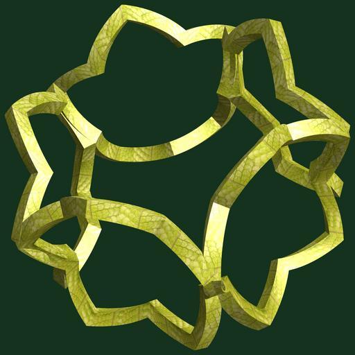 | Keywords: mathematica 3d cg parametricplot3d texture torus code program algorithm プログラム コード アルゴリズム 輪環 りんかん ドーナツ どーなつ 五芒星 ごぼうせい geometric sculpture geometricsculpture shape geometry sculpture mapping テクスチャ マッピング 模様 もよう abstract 抽象 ちゅうしょう アブストラクト design pattern デザイン パターン graphic グラフィック グラフィクス structure 意匠 構造 symmetry 対称性 たいしょうせい シンメトリー 対称 たいしょう black background curve ancient foliage plant a = 8; (* center hole size *) b = 5; (* penta-torus *) c = 3; (* distance from the center of rotation *) d = 5; (* number of torus *) h = 1; (* height of a torus *) SetOptions[ParametricPlot3D, PlotRange -> Full, Mesh -> None, Boxed -> False, Axes -> False, PlotPoints -> 400, ImageSize -> 3000, Background -> RGBColor[{20, 50, 30}/255], PlotStyle -> Directive[Specularity[White, 30], Texture[Import["D:/tmp/71.jpg"]]], TextureCoordinateFunction -> ({#4, #5 Pi} &), Lighting -> "Neutral"]; f[v_] := TriangleWave[{-1, 1}, v/(2 Pi)]; g[v_] := TriangleWave[{-1, 1}, v/(2 Pi) + 1/4]; x = (a - g[t] - f[b s]) Cos[s + 3 Pi/(4 b)]; y = (a - g[t] - f[b s]) Sin[s + 3 Pi/(4 b)]; z = (a - f[t] - h f[b s]) + c; rm = Table[{x, y, z}.RotationMatrix[2 i Pi/d, {1, 1, 0}], {i, d}]; ParametricPlot3D[rm, {t, 0, 2 Pi}, {s, 0, Pi}] (*--- The Texture *) a = 8; (* center hole size *) b = 5; (* penta-torus *) c = 3; (* distance from the center of rotation *) d = 5; (* number of torus *) h = 1; (* height of a torus *) SetOptions[ParametricPlot3D, PlotRange -> Full, Mesh -> None, Boxed -> False, Axes -> False, PlotPoints -> 400, ImageSize -> 3000, Background -> RGBColor[{20, 50, 30}/255], PlotStyle -> Directive[Specularity[White, 30], Texture[Import["D:/tmp/71.jpg"]]], TextureCoordinateFunction -> ({#4, #5 Pi} &), Lighting -> "Neutral"]; f[v_] := TriangleWave[{-1, 1}, v/(2 Pi)]; g[v_] := TriangleWave[{-1, 1}, v/(2 Pi) + 1/4]; x = (a - g[t] - f[b s]) Cos[s + 3 Pi/(4 b)]; y = (a - g[t] - f[b s]) Sin[s + 3 Pi/(4 b)]; z = (a - f[t] - h f[b s]) + c; rm = Table[{x, y, z}.RotationMatrix[2 i Pi/d, {1, 1, 0}], {i, d}]; ParametricPlot3D[rm, {t, 0, 2 Pi}, {s, 0, Pi}] (*--- The Texture *) |