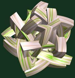 | Keywords: mathematica 3d cg parametricplot3d texture torus code program algorithm tri-torus tritorus プログラム コード アルゴリズム 輪環 りんかん ドーナツ どーなつ 四芒星 しぼうせい geometric sculpture geometricsculpture shape geometry sculpture mapping テクスチャ マッピング 模様 もよう abstract 抽象 ちゅうしょう アブストラクト design pattern デザイン パターン graphic グラフィック グラフィクス structure 意匠 構造 symmetry 対称性 たいしょうせい シンメトリー 対称 たいしょう a = 4; (* center hole size *) b = 4; (* tetra-torus *) c = 3; (* distance from the center of rotation *) d = 5; (* number of torus *) h = 2; (* height of a torus *) SetOptions[ParametricPlot3D, PlotRange -> Full, Mesh -> None, Boxed -> False, Axes -> False, PlotPoints -> 400, ImageSize -> 3000, Background -> RGBColor[{20, 50, 30}/255], PlotStyle -> Directive[Specularity[White, 70], Texture[Import["D:/tmp/862.jpg"]]], TextureCoordinateFunction -> ({#4 + #5, #5 / Pi} &), Lighting -> "Neutral"]; f[v_] := TriangleWave[{-1, 1}, v/(2 Pi)]; g[v_] := TriangleWave[{-1, 1}, v/(2 Pi) + 1/4]; x = (a - g[t] - f[b s]) Cos[s] + c; y = (a - g[t] - f[b s]) Sin[s] + c; z = (a - f[t] - h f[b s]); rm = Table[{x, y, z}.RotationMatrix[2 i Pi/d, {1, 1, 1}], {i, d}]; ParametricPlot3D[rm, {t, 0, 2 Pi}, {s, 0, 2 Pi}] (*--- The Texture *) a = 4; (* center hole size *) b = 4; (* tetra-torus *) c = 3; (* distance from the center of rotation *) d = 5; (* number of torus *) h = 2; (* height of a torus *) SetOptions[ParametricPlot3D, PlotRange -> Full, Mesh -> None, Boxed -> False, Axes -> False, PlotPoints -> 400, ImageSize -> 3000, Background -> RGBColor[{20, 50, 30}/255], PlotStyle -> Directive[Specularity[White, 70], Texture[Import["D:/tmp/862.jpg"]]], TextureCoordinateFunction -> ({#4 + #5, #5 / Pi} &), Lighting -> "Neutral"]; f[v_] := TriangleWave[{-1, 1}, v/(2 Pi)]; g[v_] := TriangleWave[{-1, 1}, v/(2 Pi) + 1/4]; x = (a - g[t] - f[b s]) Cos[s] + c; y = (a - g[t] - f[b s]) Sin[s] + c; z = (a - f[t] - h f[b s]); rm = Table[{x, y, z}.RotationMatrix[2 i Pi/d, {1, 1, 1}], {i, d}]; ParametricPlot3D[rm, {t, 0, 2 Pi}, {s, 0, 2 Pi}] (*--- The Texture *) |
