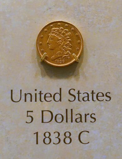 | Keywords: 5 Dollars, United States, 1838 C - National Museum of American History - DSC00215.jpg en Exhibit in the National Museum of American History Washington DC USA Photography was permitted in the museum without restriction 2015-03-27 11 31 36 own Daderot other versions cc-zero Coins in the National Museum of American History Half Eagle United States Charlotte Mint coins | ||||