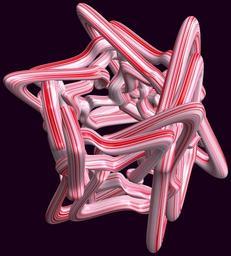 Keywords: mathematica 3d cg parametricplot3d texture torus knot 輪環 りんかん ドーナツ どーなつ 結び むすび 捩れ よじれ プログラム コード code program algorithm コード アルゴリズム geometric sculpture geometricsculpture shape geometry sculpture mapping テクスチャ マッピング 模様 もよう abstract 抽象 ちゅうしょう アブストラクト design pattern デザイン パターン graphic グラフィック グラフィクス structure 意匠 構造 symmetry 対称性 たいしょうせい シンメトリー 対称 たいしょう algorithm black background photo border surreal a = 5; (* center hole size of a torus *) b1 = 4; (* number of cross *) b2 = 3; (* number of cross *) c = 7; (* distance from the center of rotation *) d = 5; (* number of torus *) w = 3; (* gap width *) SetOptions[ParametricPlot3D, PlotRange -> Full, Mesh -> None, Boxed -> False, Axes -> None, PlotPoints -> 400, ImageSize -> 3000, Background -> Darker[Purple, 0.8], PlotStyle -> Directive[Specularity[White, 90], Texture[Import["D:/tmp/86.jpg"]]], TextureCoordinateFunction -> ({#4 + #5, #5 / Pi} &), Lighting -> "Neutral"]; g[v_] := Sum[Cos[(2 k - 1) v]/(2 k - 1), {k, 4}]; x = (a - Cos[t] + w Sin[b1 s]) g[b2 s] + c; y = (a - Cos[t] + w Sin[b1 s]) Sin[b2 s] + c; z = Cos[b1 s] + Sin[t] + c; rot = Table[{x, y, z}.RotationMatrix[2 i Pi/d, {1, 1, 0}], {i, d}]; ParametricPlot3D[rot, {t, 0, 2 Pi}, {s, 0, 2 Pi}] (*--- The Texture is this: www.flickr.com/photos/tanaka_juuyoh/5412528282/ *) a = 5; (* center hole size of a torus *) b1 = 4; (* number of cross *) b2 = 3; (* number of cross *) c = 7; (* distance from the center of rotation *) d = 5; (* number of torus *) w = 3; (* gap width *) SetOptions[ParametricPlot3D, PlotRange -> Full, Mesh -> None, Boxed -> False, Axes -> None, PlotPoints -> 400, ImageSize -> 3000, Background -> Darker[Purple, 0.8], PlotStyle -> Directive[Specularity[White, 90], Texture[Import["D:/tmp/86.jpg"]]], TextureCoordinateFunction -> ({#4 + #5, #5 / Pi} &), Lighting -> "Neutral"]; g[v_] := Sum[Cos[(2 k - 1) v]/(2 k - 1), {k, 4}]; x = (a - Cos[t] + w Sin[b1 s]) g[b2 s] + c; y = (a - Cos[t] + w Sin[b1 s]) Sin[b2 s] + c; z = Cos[b1 s] + Sin[t] + c; rot = Table[{x, y, z}.RotationMatrix[2 i Pi/d, {1, 1, 0}], {i, d}]; ParametricPlot3D[rot, {t, 0, 2 Pi}, {s, 0, 2 Pi}] (*--- The Texture is this: www.flickr.com/photos/tanaka_juuyoh/5412528282/ *)