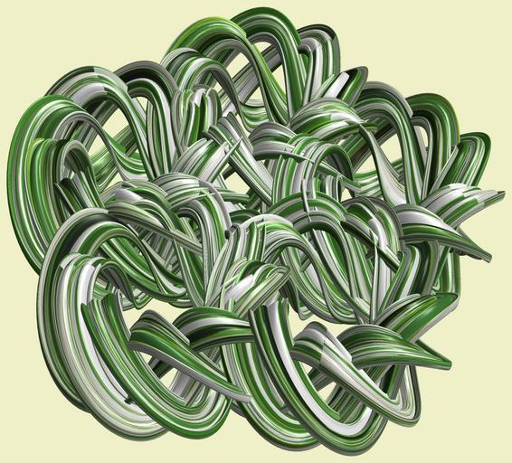 | Keywords: mathematica 3d cg parametricplot3d texture torus code program algorithm プログラム コード アルゴリズム 輪環 りんかん ドーナツ どーなつ トーラス とーらす knot 結び目 むすびめ mapping テクスチャ マッピング 模様 もよう design pattern デザイン パターン graphic グラフィック グラフィクス structure 意匠 構造 symmetry 対称性 たいしょうせい シンメトリー 対称 たいしょう indoor white background drawing a = 12; (* center hole size of a torus *) b1 = 9;(* the number of angles *) b2 = 4;(* the number of waves *) b3 = 4; (* the number of knots *) c = 14; (* distance from the center of rotation *) d = 5; (* the number of tori *) h1 = 3; (* width of a torus *) h2 = 3; (* width of a torus *) h3 = 10; (* height of cross *) SetOptions[ParametricPlot3D, PlotRange -> Full, Mesh -> None, Boxed -> False, Axes -> None, PlotPoints -> 500, ImageSize -> 3000, Background -> RGBColor[{240, 240, 200}/255], PlotStyle -> Directive[Specularity[White, 50], Texture[Import["D:/tmp/911.jpg"]]], TextureCoordinateFunction -> ({#4, #5 /Pi} &), Lighting -> "Neutral"]; x = (a - h1 Cos[t] + h2 Sin[b1 s]) Cos[b3 s] + c; y = (a - h1 Cos[t] + h2 Sin[b1 s]) Sin[b3 s] + c; z = h3 Cos[b1 s] + Sin[b2 t] + c; rm = Table[{x, y, z}.RotationMatrix[2 i Pi/d, {0, 0, 1}], {i, d}]; ParametricPlot3D[rm, {t, 0, 2 Pi}, {s, 0, 2 Pi}] (*--- The Texture Another shapes and colors *) a = 12; (* center hole size of a torus *) b1 = 9;(* the number of angles *) b2 = 4;(* the number of waves *) b3 = 4; (* the number of knots *) c = 14; (* distance from the center of rotation *) d = 5; (* the number of tori *) h1 = 3; (* width of a torus *) h2 = 3; (* width of a torus *) h3 = 10; (* height of cross *) SetOptions[ParametricPlot3D, PlotRange -> Full, Mesh -> None, Boxed -> False, Axes -> None, PlotPoints -> 500, ImageSize -> 3000, Background -> RGBColor[{240, 240, 200}/255], PlotStyle -> Directive[Specularity[White, 50], Texture[Import["D:/tmp/911.jpg"]]], TextureCoordinateFunction -> ({#4, #5 /Pi} &), Lighting -> "Neutral"]; x = (a - h1 Cos[t] + h2 Sin[b1 s]) Cos[b3 s] + c; y = (a - h1 Cos[t] + h2 Sin[b1 s]) Sin[b3 s] + c; z = h3 Cos[b1 s] + Sin[b2 t] + c; rm = Table[{x, y, z}.RotationMatrix[2 i Pi/d, {0, 0, 1}], {i, d}]; ParametricPlot3D[rm, {t, 0, 2 Pi}, {s, 0, 2 Pi}] (*--- The Texture Another shapes and colors *) |