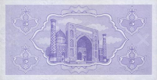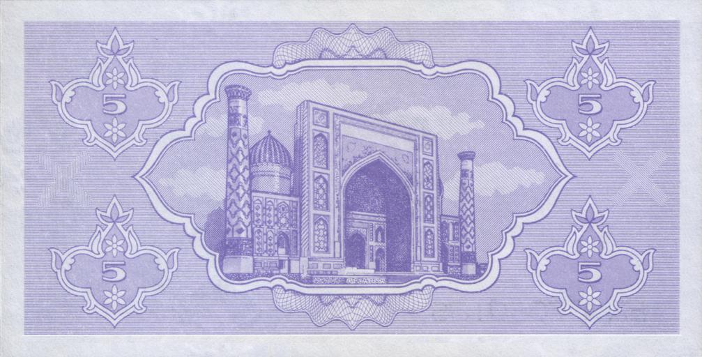 | Keywords: 5 som. Uzbekistan, 1992 b.jpg  5 сум Узбекистана 1992 5 sum of Uzbekistan 1992 own scan 1992 Central Bank of the Republic of Uzbekistan Цент альный банк Республики Узбекистан Ўзбекистон Республикаси  а казий банки PD-UZ-exempt banknotes Banknotes of Uzbekistan 1992 Banknotes with Sherdor madrasah drawings Banknotes with a face value of 5 Purple banknotes |