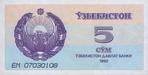 | Keywords: 5 som. Uzbekistan, 1992 a.jpg  5 сум Узбекистана 1992 5 sum of Uzbekistan 1992 own scan 1992 Central Bank of the Republic of Uzbekistan Цент альный банк Республики Узбекистан Ўзбекистон Республикаси  а казий банки PD-UZ-exempt banknotes  Banknotes of Uzbekistan 1992 Banknotes with a face value of 5 Purple banknotes Coats of arms of Uzbekistan on banknotes |