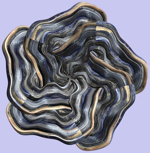 | Keywords: mathematica 3d cg parametricplot3d texture torus code program algorithm プログラム コード アルゴリズム 輪環 りんかん ドーナツ どーなつ トーラス とーらす mapping テクスチャ マッピング 模様 もよう abstract 抽象 ちゅうしょう アブストラクト design pattern デザイン パターン graphic グラフィック グラフィクス structure 意匠 構造 symmetry 対称性 たいしょうせい シンメトリー 対称 たいしょう drawing painting surreal indoor white background sketch tangle a = 7; (* center hole size of a torus *) b1 = 4;(* the number of angles *) b2 = 4;(* the number of waves *) c = 4; (* distance from the center of rotation *) d = 5; (* the number of tori *) h1 = 3; (* width of a torus *) h2 = 1; (* width of a torus *) SetOptions[ParametricPlot3D, PlotRange -> Full, Mesh -> None, Boxed -> False, Axes -> None, PlotPoints -> 500, ImageSize -> 3000, Background -> RGBColor[{200, 200, 240}/255], PlotStyle -> Directive[Specularity[White, 70], Texture[Import["D:/tmp/94.jpg"]]], TextureCoordinateFunction -> ({#4, #5 Pi} &), Lighting -> "Neutral"]; f[v_] := Sin[2 Sin[Sin[Sin[v]]]]; x = (a - h1 Cos[t] + h2 f[b1 s]) Cos[s] + c; y = (a - h1 Cos[t] + h2 f[b1 s]) Sin[s] + c; z = f[b2 t]; rm = Table[{x, y, z}.RotationMatrix[2 i Pi/d, {0, 1, 2}], {i, d}]; ParametricPlot3D[rm, {t, 0, 2 Pi}, {s, 0, 2 Pi}] (*--- The Texture *) a = 7; (* center hole size of a torus *) b1 = 4;(* the number of angles *) b2 = 4;(* the number of waves *) c = 4; (* distance from the center of rotation *) d = 5; (* the number of tori *) h1 = 3; (* width of a torus *) h2 = 1; (* width of a torus *) SetOptions[ParametricPlot3D, PlotRange -> Full, Mesh -> None, Boxed -> False, Axes -> None, PlotPoints -> 500, ImageSize -> 3000, Background -> RGBColor[{200, 200, 240}/255], PlotStyle -> Directive[Specularity[White, 70], Texture[Import["D:/tmp/94.jpg"]]], TextureCoordinateFunction -> ({#4, #5 Pi} &), Lighting -> "Neutral"]; f[v_] := Sin[2 Sin[Sin[Sin[v]]]]; x = (a - h1 Cos[t] + h2 f[b1 s]) Cos[s] + c; y = (a - h1 Cos[t] + h2 f[b1 s]) Sin[s] + c; z = f[b2 t]; rm = Table[{x, y, z}.RotationMatrix[2 i Pi/d, {0, 1, 2}], {i, d}]; ParametricPlot3D[rm, {t, 0, 2 Pi}, {s, 0, 2 Pi}] (*--- The Texture *) |