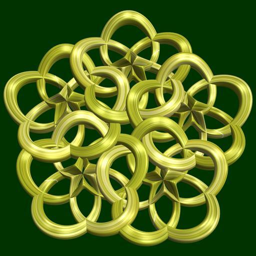 | Keywords: mathematica 3d cg parametricplot3d texture torus 輪環 りんかん ドーナツ どーなつ トーラス code program コード プログラム algorithm コード アルゴリズム geometric sculpture geometricsculpture shape geometry sculpture mapping テクスチャ マッピング 模様 もよう abstract 抽象 ちゅうしょう アブストラクト design pattern デザイン パターン graphic グラフィック グラフィクス structure 意匠 構造 symmetry 対称性 たいしょうせい シンメトリー 対称 たいしょう algorithm tangle curve indoor a = 5; (* center hole size of a torus *) b1 = 5; (* number of cross *) b2 = 3; (* number of cross *) c = 7; (* distance from the center of rotation *) d = 5; (* number of torus *) w = 4; (* gap width *) SetOptions[ParametricPlot3D, PlotRange -> Full, Mesh -> None, Boxed -> False, Axes -> None, PlotPoints -> 400, ImageSize -> 3000, Background -> Darker[Green, 0.8], PlotStyle -> Directive[Specularity[White, 90], Texture[Import["D:/tmp/71.jpg"]]], TextureCoordinateFunction -> ({#4 + #5, #5 / Pi} &), Lighting -> "Neutral"]; f[v_] := Sin[2 Sin[Sin[Sin[v]]]]; g[v_] := Cos[2 Cos[Cos[Cos[v]]]]; x = (a - Cos[t] + w Sin[b1 s]) Cos[b2 s] + c; y = (a - Cos[t] + w Sin[b1 s]) Sin[b2 s] + c; z = w g[b1 s] + f[t] + c; rot = Table[{x, y, z}.RotationMatrix[2 i Pi/d, {0, 0, 1}], {i, d}]; ParametricPlot3D[rot, {t, 0, 2 Pi}, {s, 0, 2 Pi}] (*--- The Texture is this: www.flickr.com/photos/tanaka_juuyoh/5239255695/ *) a = 5; (* center hole size of a torus *) b1 = 5; (* number of cross *) b2 = 3; (* number of cross *) c = 7; (* distance from the center of rotation *) d = 5; (* number of torus *) w = 4; (* gap width *) SetOptions[ParametricPlot3D, PlotRange -> Full, Mesh -> None, Boxed -> False, Axes -> None, PlotPoints -> 400, ImageSize -> 3000, Background -> Darker[Green, 0.8], PlotStyle -> Directive[Specularity[White, 90], Texture[Import["D:/tmp/71.jpg"]]], TextureCoordinateFunction -> ({#4 + #5, #5 / Pi} &), Lighting -> "Neutral"]; f[v_] := Sin[2 Sin[Sin[Sin[v]]]]; g[v_] := Cos[2 Cos[Cos[Cos[v]]]]; x = (a - Cos[t] + w Sin[b1 s]) Cos[b2 s] + c; y = (a - Cos[t] + w Sin[b1 s]) Sin[b2 s] + c; z = w g[b1 s] + f[t] + c; rot = Table[{x, y, z}.RotationMatrix[2 i Pi/d, {0, 0, 1}], {i, d}]; ParametricPlot3D[rot, {t, 0, 2 Pi}, {s, 0, 2 Pi}] (*--- The Texture is this: www.flickr.com/photos/tanaka_juuyoh/5239255695/ *) |