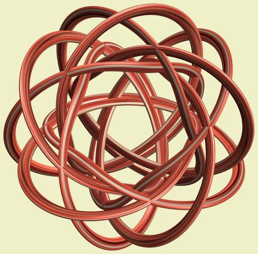 Keywords: mathematica 3d cg parametricplot3d texture torus code program algorithm プログラム コード アルゴリズム 輪環 りんかん ドーナツ どーなつ lissajous リサージュ mesh 網目 あみめ トーラス とーらす geometric sculpture geometricsculpture shape geometry sculpture mapping テクスチャ マッピング 模様 もよう design pattern デザイン パターン graphic グラフィック グラフィクス structure 意匠 構造 symmetry 対称性 たいしょうせい シンメトリー 対称 たいしょう tangle wheel round circle a = -14; (* center hole size of a torus *) b1 = 3;(* number of cross *) b2 = 2;(* number of cross *) c = -4; (* distance from the center of rotation *) d = 5; (* number of torus *) w = 4; (* gap width *) h = 0.5; (* height *) SetOptions[ParametricPlot3D, PlotRange -> Full, Mesh -> None, Boxed -> False, Axes -> None, PlotPoints -> 500, ImageSize -> 3000, Background -> RGBColor[{240, 240, 200}/255], PlotStyle -> Directive[Specularity[White, 70], Texture[Import["D:/tmp/93.jpg"]]], TextureCoordinateFunction -> ({#4, #5/Pi} &), Lighting -> "Neutral"]; x = (a - Cos[t] + w Sin[b1 s]) Cos[b2 s]; y = (a - Cos[t] + w Sin[b1 s]) Sin[b2 s]; z = h (w Sin[b1 s] + Sin[t]) + c; rm = Table[{x, y, z}.RotationMatrix[2 i Pi/d, {1, 1, 1}], {i, d}]; ParametricPlot3D[rm, {t, 0, 2 Pi}, {s, 0, 2 Pi}] (*--- The Texture *) a = -14; (* center hole size of a torus *) b1 = 3;(* number of cross *) b2 = 2;(* number of cross *) c = -4; (* distance from the center of rotation *) d = 5; (* number of torus *) w = 4; (* gap width *) h = 0.5; (* height *) SetOptions[ParametricPlot3D, PlotRange -> Full, Mesh -> None, Boxed -> False, Axes -> None, PlotPoints -> 500, ImageSize -> 3000, Background -> RGBColor[{240, 240, 200}/255], PlotStyle -> Directive[Specularity[White, 70], Texture[Import["D:/tmp/93.jpg"]]], TextureCoordinateFunction -> ({#4, #5/Pi} &), Lighting -> "Neutral"]; x = (a - Cos[t] + w Sin[b1 s]) Cos[b2 s]; y = (a - Cos[t] + w Sin[b1 s]) Sin[b2 s]; z = h (w Sin[b1 s] + Sin[t]) + c; rm = Table[{x, y, z}.RotationMatrix[2 i Pi/d, {1, 1, 1}], {i, d}]; ParametricPlot3D[rm, {t, 0, 2 Pi}, {s, 0, 2 Pi}] (*--- The Texture *) |