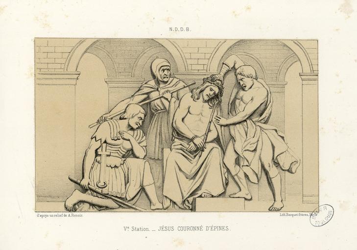 Keywords: 5e Station - Jésus couronné d'épines - Fonds Ancely - B315556101 A GORSE 12 041.jpg Fait partie d'un album de planches dessinées et lithographiées sur fond bistre par Pierre Gorse imprimées chez Becquet frères à Paris annoncées par 1 page de titre lithographiée Pl 9 à 13 dessinées par Gorse d'après un relief d'Auguste Renoir Se vend au profit de la restauration de la Chapelle à Bétharram Ancely René 1876 - 1966 Possesseur fre public domain domaine public B315556101_A_GORSE_12_041 jpg image/jpeg 1 f de pl lith en camaïeu ; 14 5 cm oblong Renoir Alexandre Illustrateur Becquet 18 - 18 ; imprimeur Lithographe Vignancour E Editeur http //numerique bibliotheque toulouse fr/collect/general/index/assoc//ark /74899/B315556101_A_GORSE_12_041 dir/B315556101_A_GORSE_12_041 jpg Bibliothèque municipale de Toulouse A-GORSE 12-13 Creator Pierre Gorse http //catalogues toulouse fr/web2/tramp2 exe/do_keyword_search/log_in setting_key BMT1 servers 1home query p000821 vignette http //numerique bibliotheque toulouse fr/collect/general/index/assoc//ark /74899/B315556101_A_GORSE_12_041 dir/B315556101_A_GORSE_12_041_thumb jpeg century 19 5e Station - Jésus couronné d'épines B315556101_A_GORSE_12_041 lithography - print Lestelle-Bétharram Pierre Gorse Historical images of Pyrénées-Atlantiques Drawings of Jesus Christ being crowned with thorns Notre-Dame Bétharram |